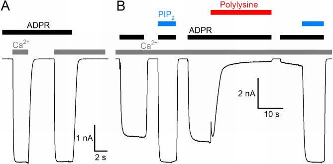 Figure 1. Basic functional properties of the Nematostella vectensis (nv) TRPM2 channel.(A) Macroscopic inward Na+ currents in an inside-out patch excised from a Xenopus laevis oocyte overexpressing nvTRPM2, evoked by superfusion of the cytoplasmic patch surface with 100 μM ADPR (black bar) plus 40 μM free Ca2+ (gray bars); extracellular (pipette) [Ca2+] was ~1 nM, membrane potential was â20 mV. (B) Effects of 25 μM dioctanoyl-PIP2 (blue bars) on nvTRPM2 channel currents before and after exposure to 15 μg/ml polylysine (red bar). Conditions as in (A). |