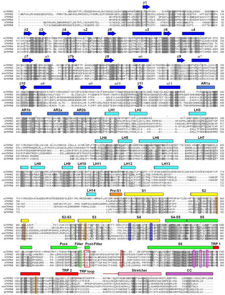 Figure 2âfigure supplement 3. Multiple sequence alignment of TRPM proteins.Sequence alignment of TRPM2, TRPM4, TRPM5, and TRPM8 channel orthologs (h: human, nv: Nematostella vectensis, mm: Mus musculus, fa: Ficedula albicollis) predicted by Clustal Omega (Li et al., 2015), and manually adjusted in the pore region. Conserved residues are shaded according to percentage of identity using Jalview (Waterhouse et al., 2009). Secondary structure elements are shown for nvTRPM2 above the sequences, and colored according to Figure 2. Colored boxes identify residues discussed in the text: residues involved in Ca2+ coordination (orange boxes), conserved arginines in helix S4 (blue boxes), residues that form the post-filter helix in nvTRPM2, and that corresponding to K1047 in nvTRPM2 (red boxes), negative residues in nvTRPM2 inner vestibule (pink boxes). |