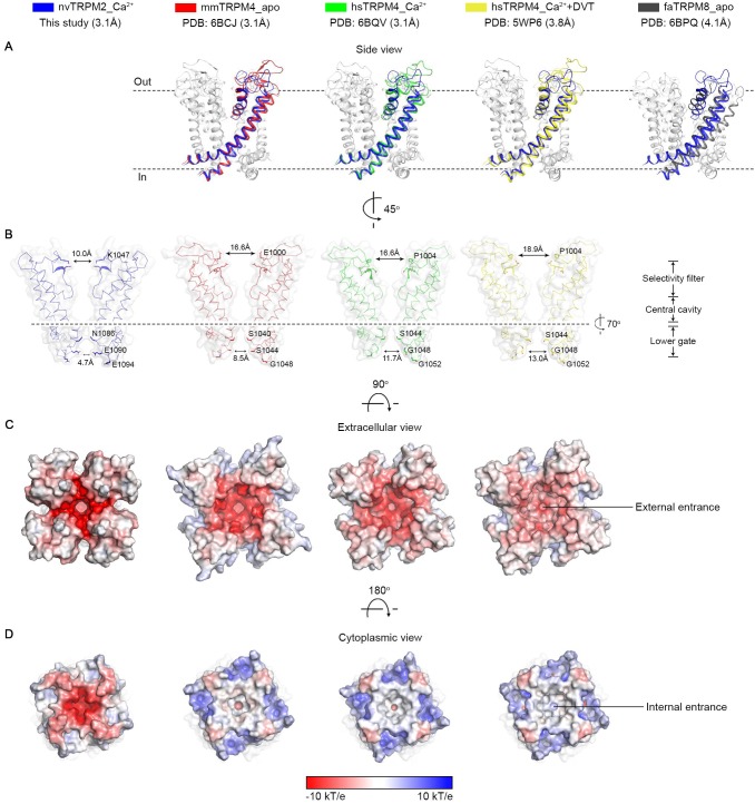 Figure 3—figure supplement 1. Structural comparisons between the ion channel pore of nvTRPM2 and of other TRPM family channels.(A) Superposition of the pore region (S5–S6) between nvTRPM2 and other TRPM family structures. The same structures as those in Figure 2—figure supplement 5 were used for comparison. Only one subunit is colored, the other three are gray. The root-mean-square deviations (RMSDs) between nvTRPM2 (blue) and mmTRPM4_apo (red), hsTRPM4_Ca2+ (green), hsTRPM4_Ca2++DVT (yellow), and faTRPM8_apo (gray) are 1.5 Å (457 Cα atoms), 1.6 Å (448 Cα atoms), 1.6 Å (444 Cα atoms), and 3.4 Å (267 Cα atoms), respectively. (B) Comparison of diameters of the external and internal vestibule of nvTRPM2 and of various TRPM4 structures. Side chains important for shaping both vestibules are highlighted as sticks. (C–D) Electrostatic surface representations showing the external (C) and internal (D) entrances of the pore for nvTRPM2 and for various TRPM4 structures. |
