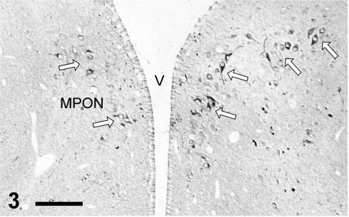 Cone-opsin IR in the hypothalamic MPON (magnocellular preoptic nucleus). Many immunopositive cell somata (some of them indicated by arrows) can be seen sparsely within this nucleus (V, third ventricle). Bar: 100 μm.
