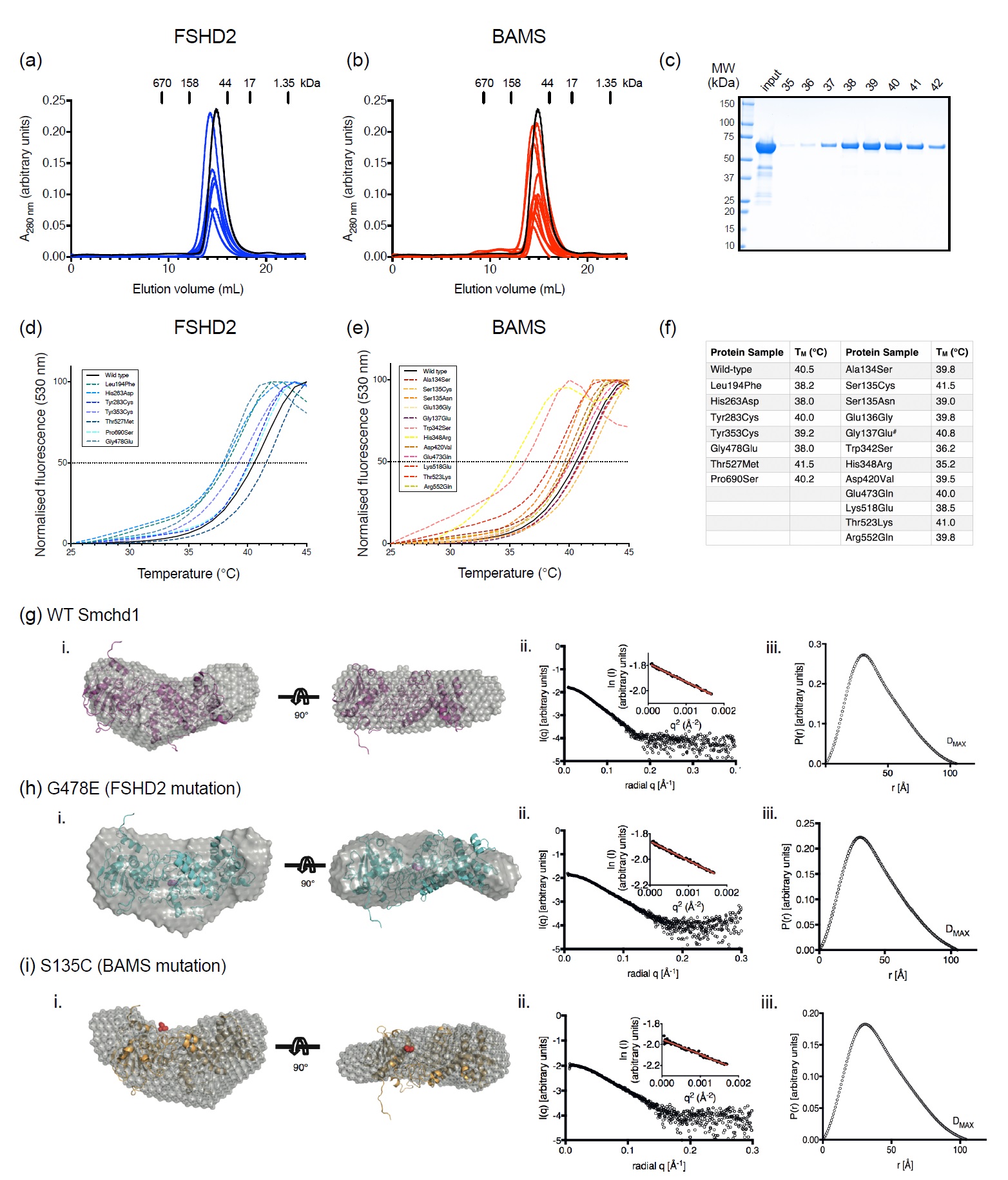 (d-e) Thermal shift assay (TSA) results of all studied (d) FSHD2 and (e) BAMS mutants; indicating