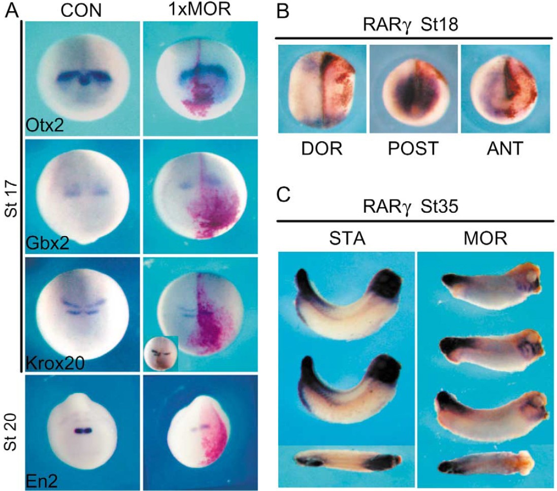causes a hindbrain-specific inhibition of RARg transcription. (B) Dorsal, posterior, and anterior aspects of a stage 18 neurulaembryo injected with 42 ng of