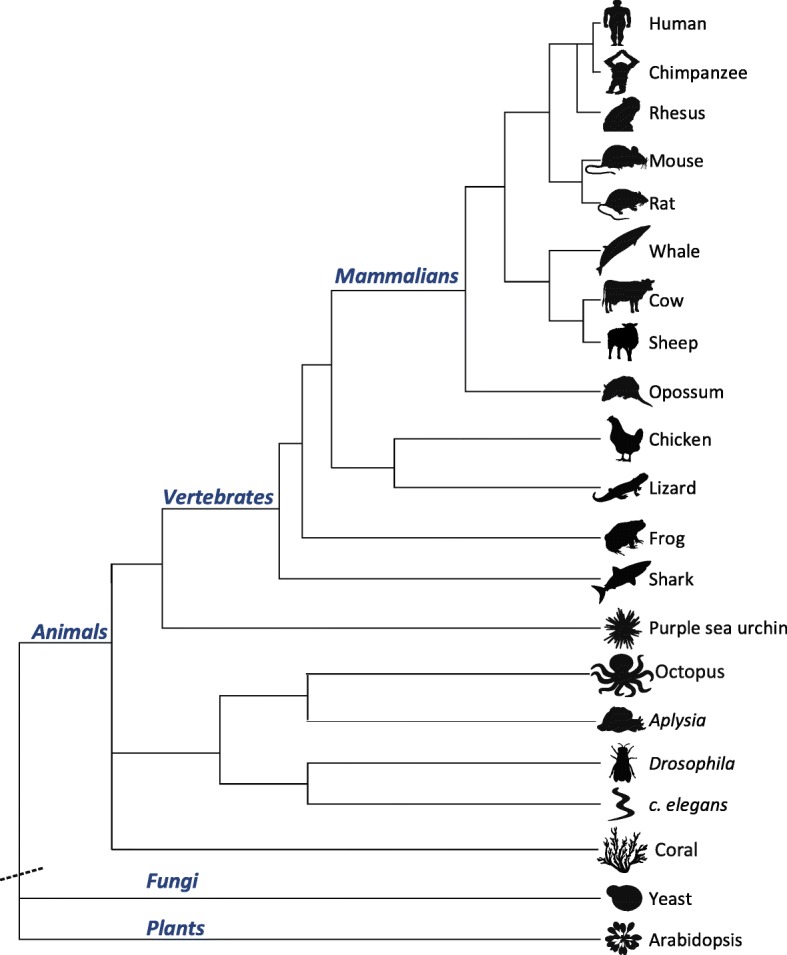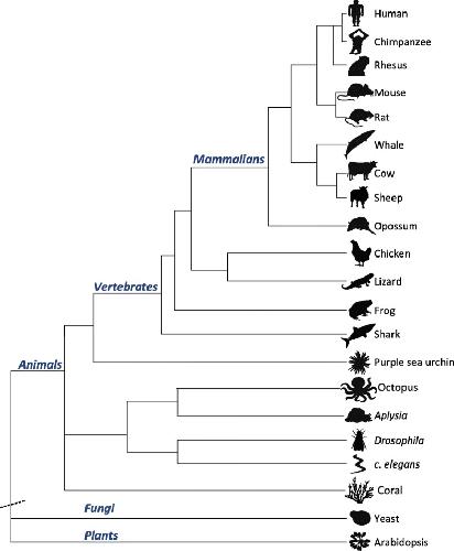 Fig. 2. Phylogenetic tree of the studied organisms (based on the UCSC Genome Browser [59]). The lengths of branches in the phylogenetic tree are not drawn to scale