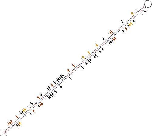 Harbinger is the most edited repeat family in Xenopus tropicalis, belonging to the DNA repeat class. The Harbinger repeats are palindromic, likely forming tight dsRNA structures. Here we show the predicted secondary structure (using MFOLD [60]) for a single representative Harbinger repeat (221-bp in length; located at GL172703: 562862-563082) which was found to be highly hyper-edited (65/77 adenosines were found hyper-edited; marked with arrows). Clearly, tight dsRNA is formed without the requirement of nearby reverse-oriented similar repeat, explaining the high level of hyper-editing in Xenopus tropicalis. We measured the editing level for each site (using all reads, including ones that were normally aligned to the region). Strongly edited sites (>30%) are marked with red arrows, moderately edited sites (1–30%) with orange arrows, and black arrows point to sites that were not found edited by the non-hyper-edited reads (or were not covered by those reads), see also Additional file 1: Figure S7