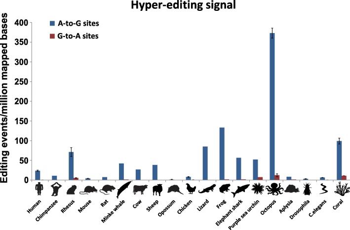 Fig. 3. Comparing the normalized hyper-editing signal for 19 different species. The level of hyper-editing is measured by the number of A-to-G mismatches in the identified clusters per million mapped bases (standard errors bars are presented for nine species for which we had biological replicates, Additional file 1: Figure S8). For comparison, the numbers of G-to-A clusters (found using the same parameters) are presented, representing the expected false-positive rate