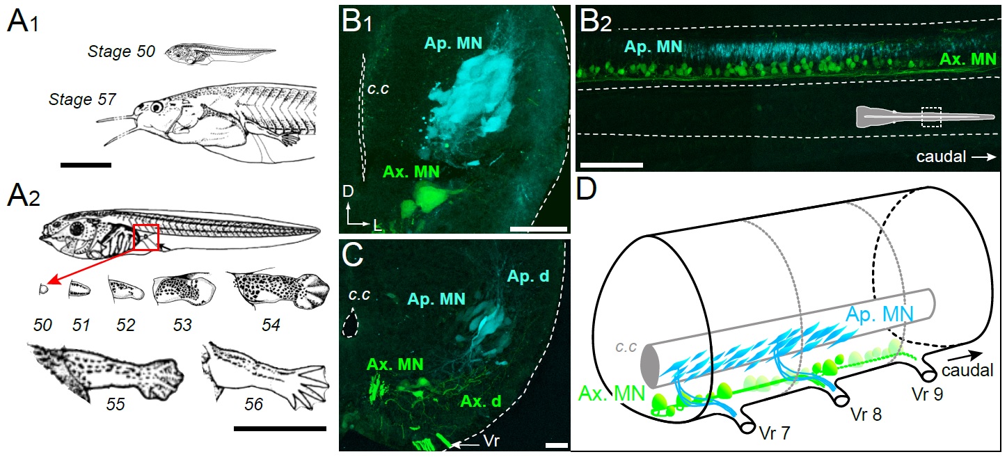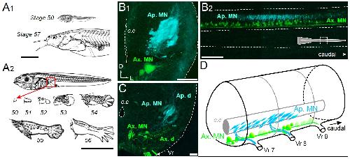 Figure 1. Developmental stages of X. laevis and anatomical organization of the spinal motor columns. A. Relative size differences between stage 50 and 57 larvae (A1) and associated morphological changes of the hindlimb bud during metamorphosis onset (A2), from Nieuwkoop and Faber, 1956. B, C. Segmental (B1, C) and rostrocaudal (B2) organization of the spinal motor column region containing limb MNs at stages 50-52 (B1, B2) and 55 (C). Inset in B2 shows the location of labeled MNs in the mid-region of the spinal cord. D. Schematic representation of the segmental organization of the appendicular and axial motor columns in the larval spinal cord. Ap./Ax. MNs, appendicular/axial motoneurons; Ap./Ax. d., Ap./Ax. dendrites; Vr, ventral root; c.c, central canal; SC, spinal cord; D, dorsal; L, lateral. Scale bars: B1 and C = 20 μm; B2 = 100 μm. |