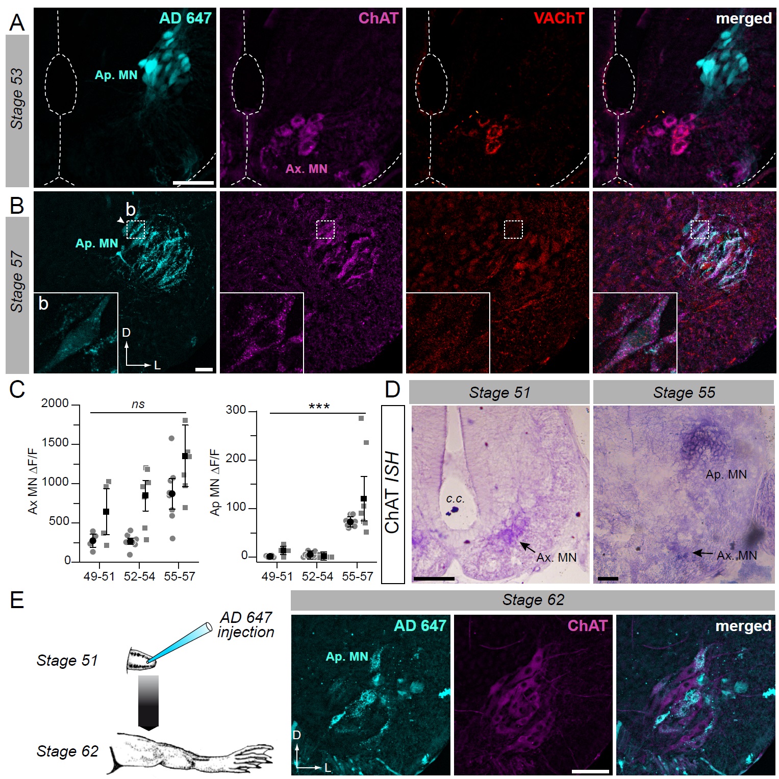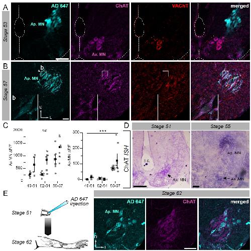 Figure 2. Developmental emergence of the molecular ACh phenotype in appendicular MNs. A, B. Examples of fluorescence immunolabeling against ChAT (magenta) and VAChT (red) in appendicular MNs (Ap. MN) labeled with retrograde Alexa Fluor dextran 647 (AD 647, cyan) in stages 53 (A) and 57 (B) tadpoles. Insets (b) in B show magnification of stage 57 appendicular MNs. C. Variation of fluorescence (δF/F) of axial (left plot) and appendicular (right plot) MNs for ChAT and VAChT immuno-signals at stages 49-51 (n=4), stages 52-54 (n=7) and stage 55-57 (n=8). Grey dots represent the averaged δF/F values for ChAT (squares) and VAChT (circles) in each preparation, and the black dots are δF/F grand means ± SEM for all preparations in a given developmental group. ns non significant, *** p<0.001, Kruskall-Wallis test. D. Examples of in situ hybridization (ISH) labeling for ChAT mRNA in the appendicular spinal column at stages 51 and 55. E. Example of fluorescence immunolabeling against ChAT in stage 62 appendicular MNs that were previously labeled with AD 647 injected into the hindlimb at stage 51 (see schematic at left ). All scale bars = 50μm; D, dorsal; L, lateral. |