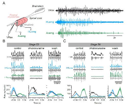 Figure 4. Switch from non-cholinergic to cholinergic limb muscle activation during axial swimming at different developmental stages. A. Rhythmic burst discharge (right panel) recorded from an axial ventral root (VRax) together with a hindlimb bud muscle (HLemg) and axial myotome (Axemg) during a spontaneous fictive swim episode in a semi-isolated stage 53 preparation (left panel). B-C. Examples of recordings before (control), during and after (wash) bath application of d-tubocurarine to a stage 53 (B) and a stage 56 (C) preparation. Lower plots in B and C show instantaneous l-HLemg (blue) and r-Axemg (green) discharge rates (spikes/s) averaged ( SEM) over 10-20 l-VRax locomotor cycles (black). Black arrow in the middle graph of B indicates persistent limb bud EMG activity occurring in phase with the ipsilateral ventral root during d-tubocurarine application, and which was no longer present at the later developmental stage (c.f., middle plot in C). |