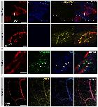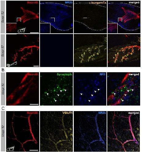 Figure 5. Switch from glutamate to acetylcholine receptors in hindlimb muscles. A. Examples of hindlimb innervation patterns and distribution of ACh nicotinic receptors in a whole-mount hindlimb bud, revealed by fluorescence immunolabeling of neurofilament associated protein (Neurofil., red), glutamate receptor (NR2b, blue) and α-bungarotoxin labeling (α-bungaroTx, yellow) respectively, at stages 52 (upper panels) and 57 (lower panels). Inset drawings at bottom left of each panel show bud morphology at the two representative larval stages. Scale bars: 200μm for stage 52, 100μm for stage 57. B. Examples of fluorescence immunolabeling against neurofilament associated protein (red), synaptophysin (Synaptoph., green) and NMDA glutamate receptor subunit 1 (NR1, blue) in whole-mount limb bud at stage 52. White arrowheads indicate sites of apposition of all 3 markers. Scale bar: 20μm. C. Examples of fluorescence immunolabeling against neurofilament associated transporter 1 (VGluT1, yellow) and the glutamate receptor subunit NR2b (blue) in whole-mount limb at stage 52. Scale bar: 50μm. |