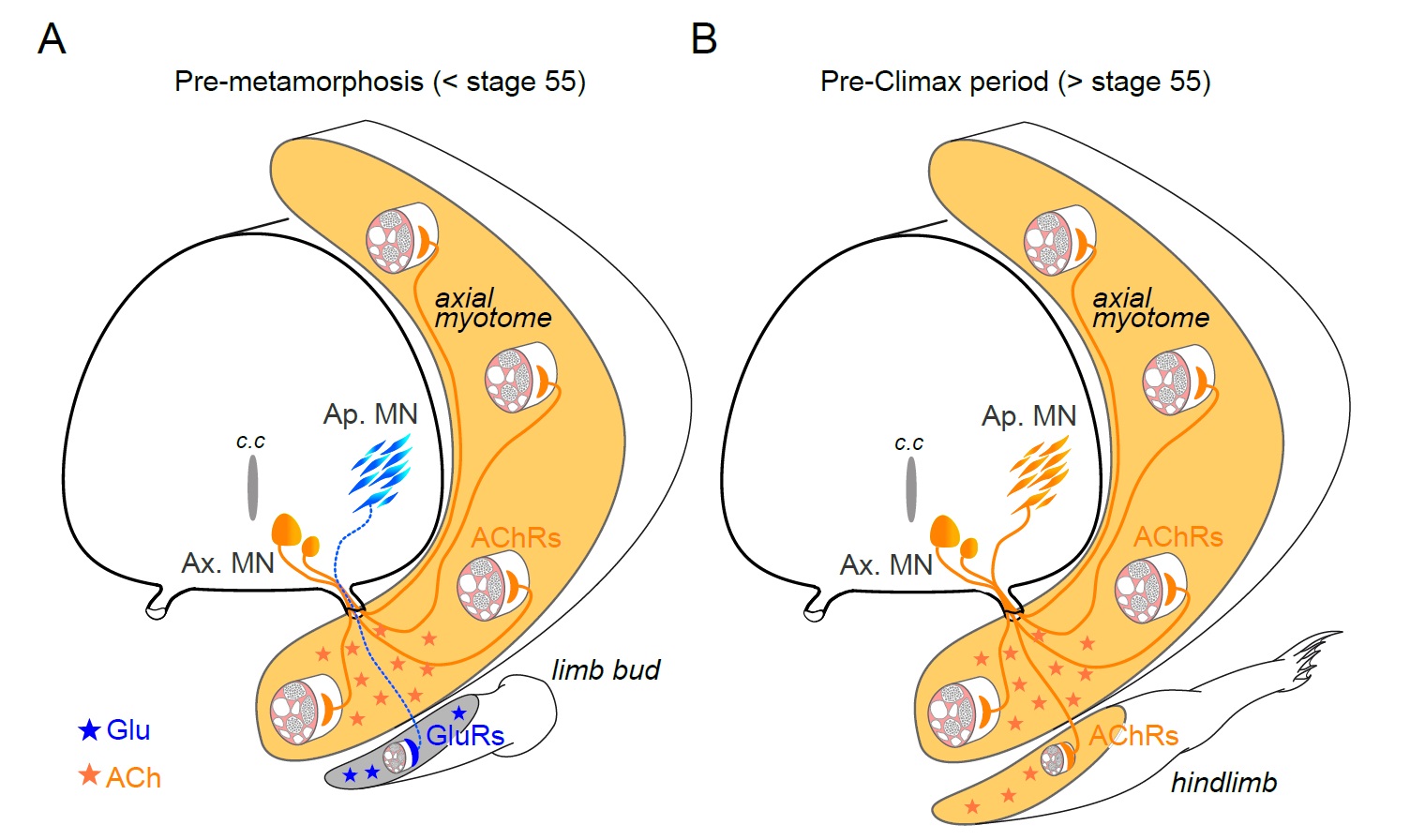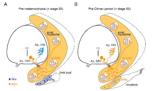 Figure 7. Schematic representation of neurotransmitter phenotype switching associated with the establishment of functional limb muscle innervation at different stages of Xenopus metamorphic development. See text for further explanation. AChRs: nicotinic ACh receptors; GluRs: glutamate 1035 receptors; Ap. MN: appendicular MNs; Ax. MN: axial MNs; c.c: central canal |