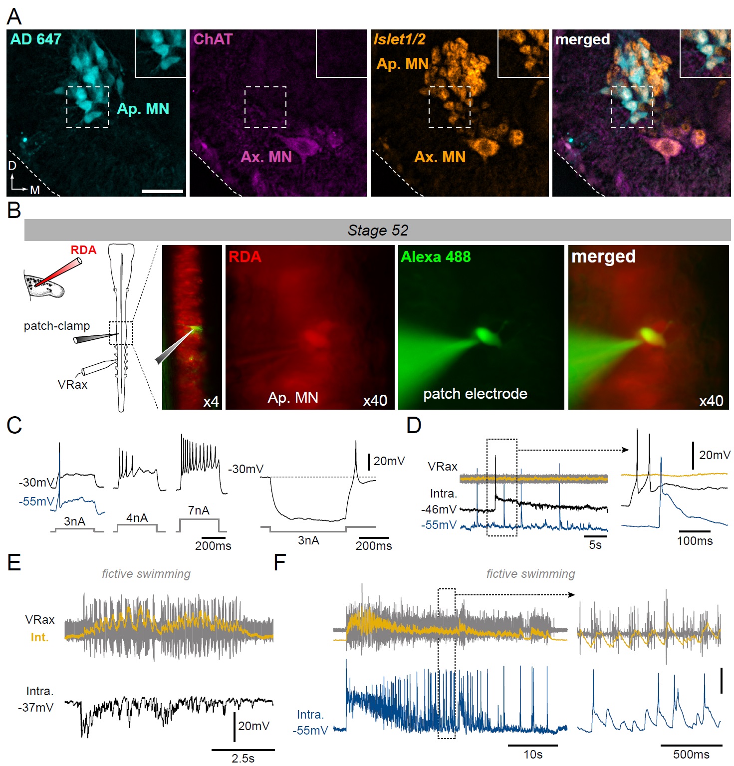 Figure 3. Motoneuronal identification of non-cholinergic limb projecting neurons. A. Example of fluorescence immunolabeling against ChAT (magenta) and Islet1/2 (orange) in appendicular and axial MNs (Ap. MN, Ax. MN) in a stage 52 tadpole. Appendicular MNs were previously labeled with retrograde Alexa Fluor dextran 647 (AD 647, cyan). Scale bar = 50μm; D, dorsal; M, medial. B. Protocol for intracellular recordings from appendicular MNs. Stage 52 MNs were identified by prior rhodamine dextran amine (RDA) retrograde labeling |