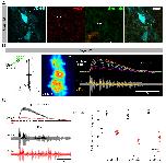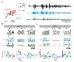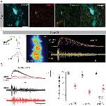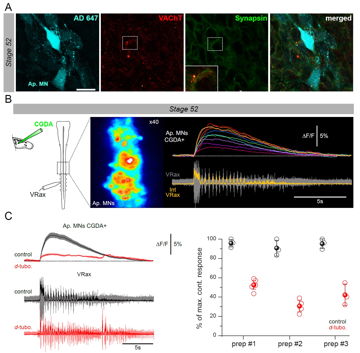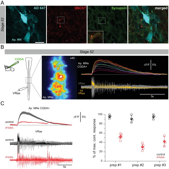 Figure 4 supplement 1. Appendicular MNs are activated centrally by cholinergic inputs. A. Immuno-labeling of putative cholinergic synapses on limb MNs retrogradely labeled with Alexa Fluor dextran 647 (AD 647), using antibodies against VAChT and the synaptic marker synapsin [mouse anti-synapsin (1:200; Synaptic Systems, Germany) revealed by secondary donkey anti-mouse antibodies coupled to Alexa Fluor 488 (1:500; Thermo Fischer)]. Both VAChT and synapsin fluorescent signals were found in close apposition surrounding MN cell bodies, indicating the presence of cholinergic input synapses. Inset: enlargement of synapsin and VAChT signals in the vicinity of an appendicular MN cell body. Scale bar = 20μm B. Calcium imaging optical recordings (20 fps) from stage 52 limb MNs retrogradely filled with Calcium Green Dextran Amine 3kD (CGDA, Invitrogen; see schematic at left) during fictive swimming (n=3). Right panel: individual calcium signals (δF/F) recorded simultaneously from 10 MN somata (encircled in x40 image at left) during a swim episode recorded from an axial VR (lower trace). C. Left panel: average fluorescence variation (black trace; ô² SEM, shaded area; top) for the 10 MNs illustrated in B during fictive swimming (bottom) in control (black) and in the presence of 50μM d-tubocurarine (d-tubo.; red). Right panel: mean calcium transient amplitudes in control (black) and under d-tubocurarine (red) expressed as a percentage of the maximal control amplitude (i.e.,δF/F peak soon after swim episode onset) for three stage 52 preparations. Unfilled circles represent single acquisitions; filled circles denote grand means ô² SEM. Long term calcium recordings were performed in control experiments without drug application to avoid any fluorescence bleaching effect. |
