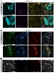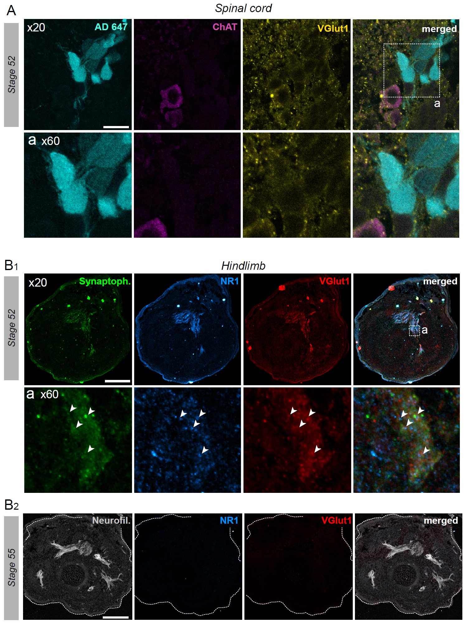 Figure 5 supplement 1. VGluT1 expression appendicular MNs. A. Fluorescence immunolabeling against ChAT (red) and VGluT1 (yellow) in limb MNs retrogradely labeled with Alexa Fluor dextran 647 (AD 647, cyan) at stage 52. Whereas ChAT is absent from retrogradely labeled MNs, VGluT1 is expressed throughout almost the entire ventral horn, including in limb MN somata. Bottom images are magnifications of the area (a) delineated by the dotted line square in the merged image at top right. Punctiform VGluT1 expression occurred around MN somata (indicating labeling of glutamatergic presynaptic terminals) and a more diffuse VGluT1 signal also appeared in MN cytoplasm surrounding cell nuclei. B. Fluorescence immunolabeling against synaptophysin (Synaptoph., green), NMDA glutamate receptor subunit 1 (NR1, blue), VGluT1 (red) and neurofilament (Neurofil., grey) in hindlimb muscle tissue at stage 52 (B1) and stage 55 (B2). VGluT1 expression colocalized with synaptophysin and postsynaptic glutamate receptors were detected at stage 52, but not at stage 54. The bottom images in B1 are magnifications of the area (a) indicated in the merged image at top right. Scale bars = 20μm. |
