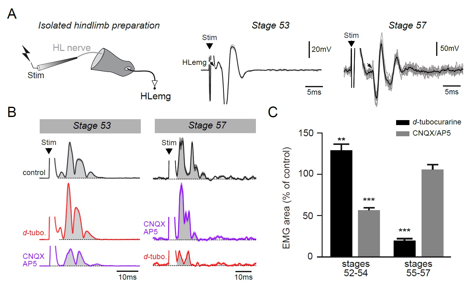 Figure 6. Functional switch in hindlimb neuromuscular transmission. A. EMG recordings (HLemg) from an isolated hindlimb preparation (schematic at left) in response to single pulse (100μs) electrical stimulation (Stim) of a limb motor nerve (HL nerve) in stages 53 and 57 larvae. In each case, the black arrow indicates the beginning of the EMG response and the black trace represents the mean profile of 6 superimposed responses. Note that the trace illustration for stage 53 was taken from a 1 mM Mg2+ saline experiment. B. Integrated motor nerve-evoked HLemg responses in control (black), and under d-tubocurarine (d-tubo.; red) or CNQX+AP5 (purple) bath application to stage 53 and 57 preparations. Thick lines represent the mean response profile (SEM); the area under each curve (grey) was used to measure the response size. C. Mean (SEM) EMG response area as percentage of control response during d-tubocurarine (black) or CNQX/AP5 (grey) bath application at stages 52-54 and 55-57, respectively. ** p<0.01 and *** p<0.001, Mann–Whitney U-test. |