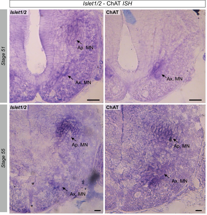 Figure 3 supplement 1. Presence of spinal Islet1 and ChAT mRNAs at different developmental stages. In situ hybridization of the two mRNAs was performed with the same protocol (see Methods). The Islet1 probe was synthesized according to Shi et al. (2009) and involved amplifying a PCR fragment of 798 pb by the primers 5â- AAGTGCAACATCGGCTTCAG-3â and 5â-GCTGTTTGGGGTATCTGGGA-3â. Despite the occasional appearance of a widespread background signal (due to differences in colorimetric reaction times), Islet1 mRNAs in darkened clusters were clearly evident in both the axial and appendicular motor columns at all developmental stages examined (stage 51 (upper left panel) and 55 (lower left panel) are illustrated), whereas ChAT mRNAs were found in limb MNs only from stage 55 onwards (c.f., upper and lower right panels). |