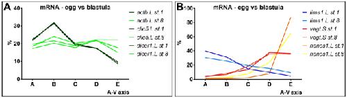 Figure 3. Animal mRNAs become evenly distributed along the A-V axis at blastula stage (A), while extremely animal, vegetal, and extremely vegetal mRNAs remain asymmetrically distributed at blastula stage (B).
