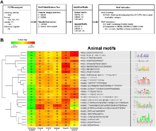 Figure 4. Scheme for the identification of localization motifs (A). Cluster analysis of the animal localization motifs identified using MEME (A1M-A27M) and GIBBS (A3G-A26G). Heatmap indicates the proportion of motifs and the numbers the percentage of the 3′UTRs that contains the motifs (B).