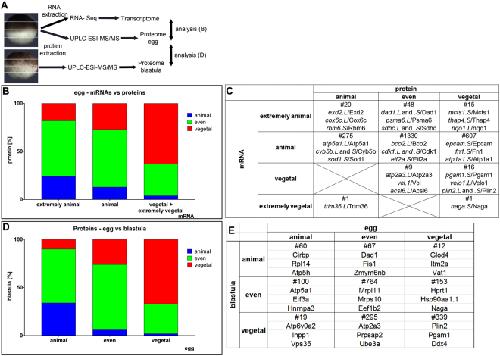 Figure 7. Proteome profiling along the A-V axis of Xenopus laevis eggs. Schematic showing the experimental design (A). Protein localization and comparison with mRNA (B). Selected candidates with similar/different localization at mRNA/protein levels with known interesting biological functions (C). Comparison of protein localization at egg and blastula (D). Examples of egg and blastula specific proteins (E).