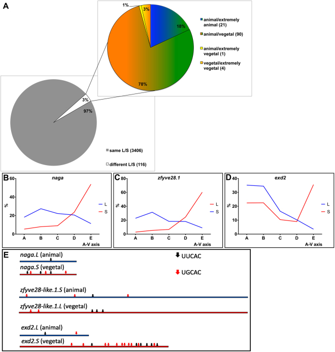 Figure 6. Analysis of homoeologous genes that show contrasting polarization. Out of more than 3500 homoeologous maternally expressed genes less than 100 showed different localization of its L and S versions. (A) Localization profiles of the L and S versions of naga, zfyve28 and exd2 (BâD). Presence of vegetal localization motifs UUCAC and UGCAC in the 3â²UTRs of naga, zfyve28 and exd2 (E).