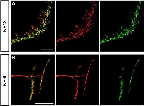Whole mounted X. tropicalis NF48 embryos at the medial ventral region (A) and longitudinal sections of Tibialis anterior longus muscles obtained from NF66 post-metamorphic X. laevis froglets (B) were immunostained to reveal neurons (3A10 plus SV2 antibodies, red) and AChR aggregates (BTX staining, green), and subsequently imaged by confocal microscopy. Scale bars: 50â¯Î¼m (A); 30â¯Î¼m (B). |