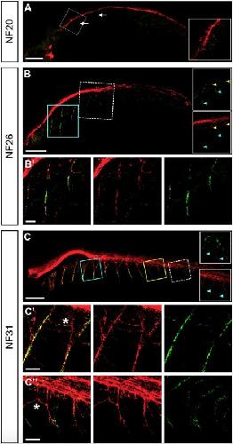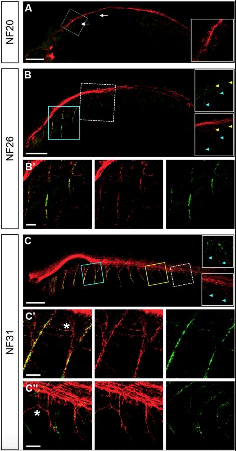 X. tropicalis embryos obtained at stages NF20 (A), 26 (B), and 31 (C) were stained by immunodetection of neurons (using 3A10 plus SV2 antibodies, red) along with staining of AChR aggregates with BTX (green), and subsequently imaged by confocal microscopy. Magnified images of the region labelled with a white dotted line square in A, B and C are shown in their respective insets (merge in A; upper: AChR, lower: neuronal staining in B and C). Magnified images of the rostral region labelled with a cyan square in B are shown in B' (left: merge, middle: neuronal, and right: AChR staining). Magnified images of the regions labelled with cyan and yellow squares in C are shown in C' and C'', respectively (left: merge, middle: neuronal, and right: AChR staining in C' and C"). Orientation of embryos: anterior (left), posterior (right), dorsal (up), ventral (down). Arrowheads in the insets of B and C label the most ventral detection of presynaptic (yellow) and postsynaptic (cyan) staining. Scale bars: 200â¯Î¼m (A,B,C); 50â¯Î¼m (B'); 40â¯Î¼m (C',C"). |
