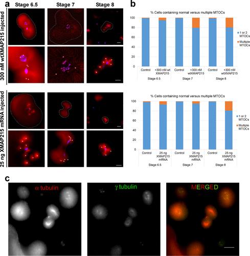 FIGURE 3: High concentrations of wtXMAP215 induce the formation of supernumerary MTOCs in early X. laevis embryos. (a) Embryos were injected at the one-cell stage with either 300 nM wtXMAP215 (top two rows) or 25 ng wtXMAP215 mRNA (bottom two rows), fixed, and then processed for immunofluorescence. MTs were imaged using indirect immunofluorescence and are shown pseudo-colored in red, whereas DNA was labeled using Sytox Green nucleic acid stain (shown pseudo-colored in blue). Images show examples of cells with supernumerary MT foci displays in blastomeres isolated at the indicated stages. Cell boundaries are indicated by dashed outlines (first and third rows). For higher-magnification images, supernumerary MTOCs are overlaid with white asterisks. Scale bar = 50 µm (images in first and third rows). Scale bar = 30 µm (images in second and fourth rows). (b) The MT foci per cell were counted and plotted at the indicated stages as the percentage of cells containing a normal number of MTOCs (i.e., 1 or 2) or supernumerary MTOC numbers (i.e., >2). The top graph shows data from embryos injected with 300 nM wtXMAP215; the bottom graph shows data taken from single-celled blastomeres injected with 25 ng XMAP215 mRNA. (c) Embryos were injected at the one-cell stage with 25 ng XMAP215 mRNA and processed for immunofluorescence for α-tubulin (pseudo-colored in red) and γ-tubulin (pseudo-colored in green). Representative images of blastomeres from stage 8 embryos containing multiple MTOCs are shown.