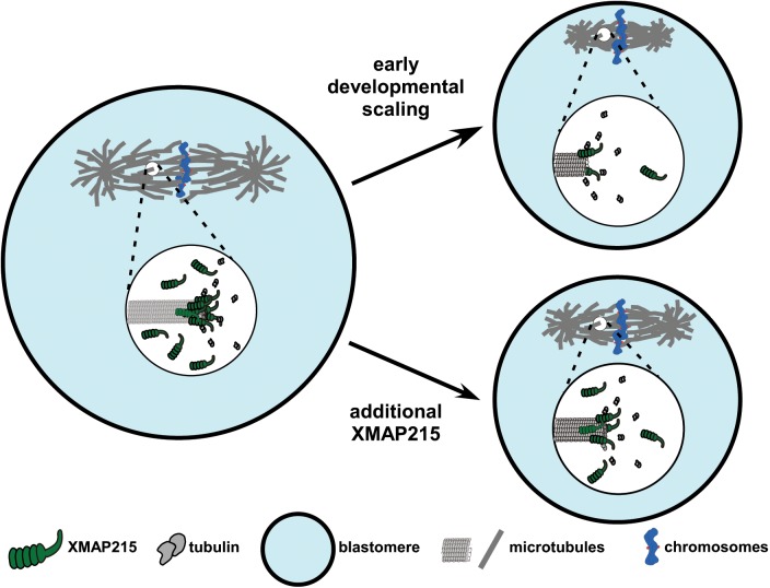 FIGURE 4:. Model of XMAP215 regulation of MT end dynamics and spindle scaling during X. laevis development. The cartoon depicts the mechanism of XMAP215-dependent spindle scaling during development. As cell size decreases during early development, the number of XMAP215 molecules in each blastomere is concomitantly reduced, resulting in fewer XMAP215 molecules per MT plus-end, slower MT growth rates and, by mass action, smaller spindles. Additional XMAP215 can compensate for this loss and, because other components are not limiting, allow for the generation of larger-than-expected spindles for a blastomere of a given size.
