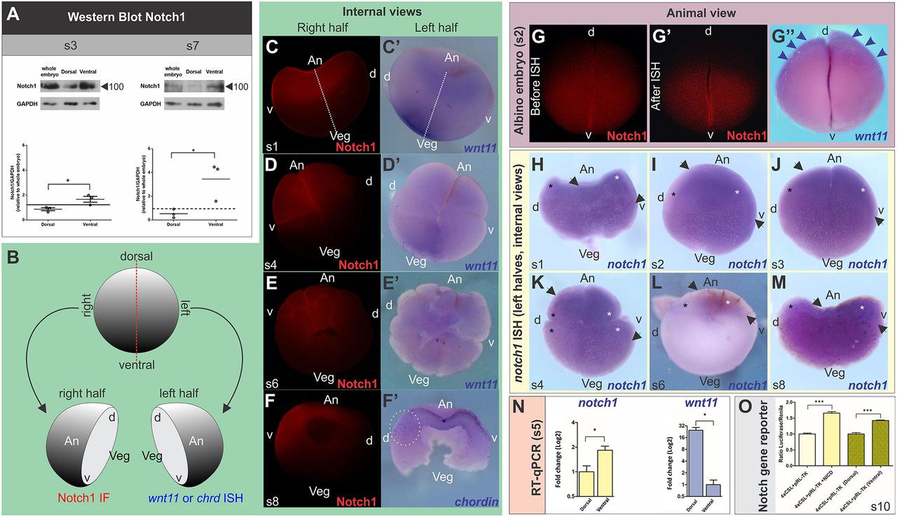 Fig. 2. The levels of Notch1 protein and mRNA and of CSL-dependent transcriptional activity are higher in the ventral side of Xenopus embryos. (A) Western blot of Notch1 in protein extracts from whole embryos and from dorsal and ventral halves at s3 and s7. At these stages, the more representative p100 band was quantified relative to GAPDH levels. Significantly higher levels of Notch1 protein were detected in ventral halves than in dorsal halves at both stages. *P<0.05 (t-test, from three independent experiments). Horizontal lines represent the mean values between the experiments; circles show the results for each experiment. (B-Fâ²) Left and right halves of pigmented embryos were cut (B, dashed red line) at the indicated stages and processed as indicated for whole-mount IF of Notch1 (right halves; C-F), or for ISH of dorsal markers in contralateral left halves (wnt11 in Câ²-Eâ², chordin in Fâ²). Notch1 IF is highest on the opposite side to the dorsal markers. The dotted white line in C,Câ² shows the animal-vegetal axis. The dotted yellow circle in Fâ² shows the population of dorsal cells that are beginning to express chordin at this stage. (G-Gâ²) The same albino two-cell embryo was processed for Notch1 IF and wnt11 ISH. Notch1 IF is shown in animal view before (G) and after (Gâ²) ISH, and it is higher on the opposite side in relation to the early dorsal marker wnt11 (Gâ², arrows). (H-M) Left halves of embryos were cut at the indicated stages and processed for ISH of notch1. A higher expression of notch1 transcripts was observed in the ventral (white asterisks) than in the dorsal region (black asterisks). The arrows indicate the approximate dorsal and ventral limits of the notch1 domain. (N) RT-qPCR quantification of notch1 and wnt11 mRNA in dorsal and ventral halves of s5 embryos. Notch1 mRNA levels were significantly higher in the ventral halves, and wnt11 mRNA levels were significantly higher in the dorsal halves (*P<0.05, one-way ANOVA). (O) Notch reporter gene analysis of CSL-dependent activity. Relative luciferase/Renilla activity was significantly increased by nicd1 mRNA (NICD) and was significantly higher in the ventral half than in the dorsal half of s10 embryos. Data are mean+s.e.m. ***P<0.05 [one-way ANOVA analysis and Bonferroni's multiple comparisons test (Student's t-test)]. s, stage. |