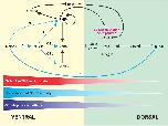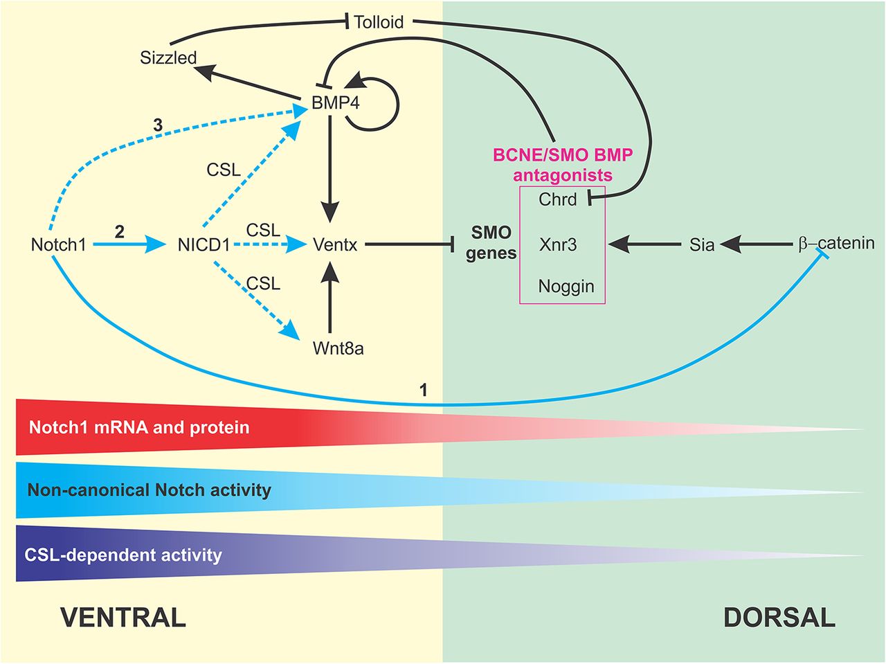 Fig. 7. Proposed model for the role of Notch1 in ventral development. Notch protein and mRNA are present in higher levels ventrally than dorsally (this work; red triangle). Ventrally enriched Notch1 participates in the control of the initial DV polarity by a dual mechanism (turquoise lines): by destabilizing the dorsal determinant β-catenin (Acosta et al., 2011; non-canonical Notch activity, turquoise triangle; route 1); or by promoting the development of the VC (this work; route 2). CSL-dependent transcriptional activity is higher ventrally than dorsally at the onset of gastrulation (this work; blue triangle). Notch1 is necessary for the expression of the ventral morphogens Wnt8a and BMP4, and the Ventx family transcriptional repressors, which are regulated in a CSL-dependent fashion around the onset of gastrulation (route 2). The dashed turquoise arrows indicate positive regulation by Notch1 on VC genes, but it remains to be answered whether it is direct or indirect. Notch1 might positively control bmp4 indirectly, by contributing to the destabilization of β-catenin in the ventral side (route 2), thus preventing the expression of BMP antagonists in this region, which otherwise would interrupt the known positive feedback loop by which bmp4 increases its own expression; however, we cannot rule out that Notch1 regulates bmp4 by other pathways (route 3). BCNE, blastula chordin and noggin expressing center; SMO, SpemannâMangold's organizer. See main text for further explanation. |