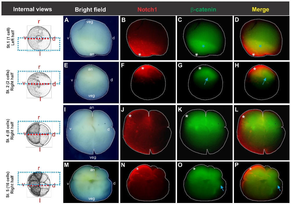 Figure S2. Distribution of endogenous Notch 1 and β-catenin proteins from s1 through cleavage stages in Xenopus embryos (internal views). Left and right halves of embryos that were cut at the indicated Nieuwkoop and Faber stages (s) (left column, turquoise dotted boxes) and processed for whole-mount IF. The embryonic early axes were predicted according to the original pigmentation. (A,E,I,M) Bright field views. (B,F,J,N) Notch1 IF. (C,G,K,O) Total β-catenin IF. (D,H,L,P) Merged images of Notch1 and total β-catenin IF. We noted that in some whole-mount halves from early embryos, total β-catenin IF appeared to have a dorsal bias (light blue arrows) or its highest levels were apparently in a different place (light blue asterisk) in relation to the region were the strongest Notch1 IF was found (white asterisks) (See Table S2). d, dorsal; v, ventral; l, left; r, right; an, animal; veg, vegetal. |