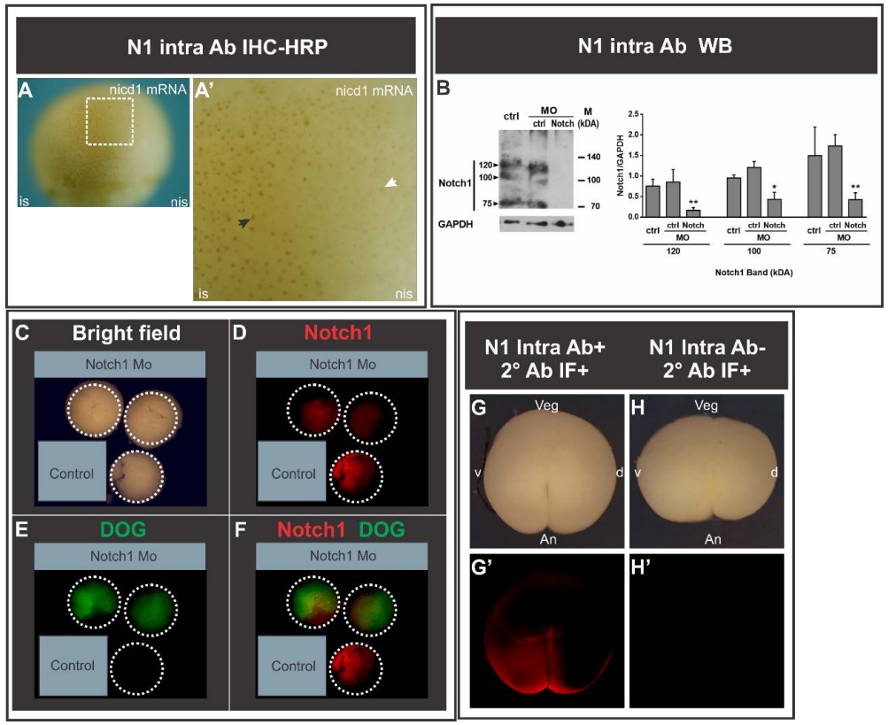 Figure S5. Notch1 intra antibody ab8387 (N1 intra Ab) specifically recognizes Notch1 protein in Xenopus laevis embryos. (A,Aâ) Embryo unilaterally injected with 1 ng of Xenopus laevis nicd1 mRNA into 1 cell at the 2-cells stage, fixed at gastrula stage and processed for immunohistochemistry with a horseradish peroxidase-conjugated secondary antibody (IHC-HRP). (Aâ) Higher magnification view of the area indicated by the dashed box in A. Diaminobenzidine brown development clearly showed a very strong and dense nuclear staining (black arrow) on the injected side (is), confirming that N1 intra Ab recognizes Xenopus laevis NICD1 when overexpressed. The non-injected side (nis) showed a lighter staining in scattered nuclei (white arrow), indicating that N1 intra Ab could also detect the endogenous NICD1. (B) Western blot (WB) analysis of protein extracts obtained at s15 from uninjected controls (ctrl), embryos injected with 80 ng of Control Mo (ctrl MO) or with 80 ng of Notch1 Mo (Notch MO) at the 1-cell stage. The N1 intra Ab recognizes bands corresponding to Notch1 normal processing (Kopan and Ilagan, 2009) in extracts from uninjected controls and from Control MO-injected embryos: one around 120 kDa, which is expected to correspond to the Notch1 fragments containing the transmembrane domain (Notch transmembrane and intracellular domain, NTMIC; Notch extracellular truncation, NEXT) and a band of around 100 kDa, which is expected to correspond to NICD (Notch intracellular domain), as has been previously shown with other antibodies recognizing Notch1 in cell and embryo extracts from mammals (Zagouras et al., 1995) (Blaumueller et al., 1997) (De Falco et al., 2015). A lower molecular weight band of 75 kDa was also observed at this stage. The three bands are specific, since they were significantly reduced by Notch1 Mo (* P< 0.05, ** P< 0.01, One Way ANOVA test). Results are shown as the mean+s.e.m. of three independent experiments. (C-F) N1 intra Ab IF (D,F, red channel) in animal hemispheres from s6 embryos that were injected at s1 with 60 ng of Notch1 Mo + DOG as tracer (upper embryos) and from a sibling uninjected control (lower embryo), photographed together. (C) Bright field image. (E, F) Green fluorescence from the tracer. Notch1 Mo decreased N1 intra Ab IF in all injected embryos (n=10), confirming that N1 intra Ab specifically recognizes Notch1 protein in Xenopus embryos. (G-Hâ) Internal views of left halves of 4- cells embryos processed for IF with anti-rabbit IgG-Alexa 594 as secondary antibody (2° Ab), with (G,Gâ) or without (H,Hâ) N1 intra Ab primary antibody. (G,H) Bright field. (G´,Hâ) Fluorescence image, red channel, of the same embryos shown in G,H, respectively. The secondary antibody did not show non-specific fluorescence. d, dorsal; v, ventral; An, animal; Veg, vegetal. |