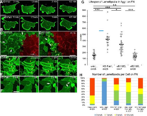 KD-Pak1 expression overcomes contact inhibition of lamellipodia. (A,B) Isolated LEM cell expressing KD-Pak1 on FN. (C,D) LEM aggregate with KD-Pak1-expressing cells (membrane-GFP, green) and control cells (membrane-RFP, red). White arrows show smooth-rimmed lamellipodia, yellow numbers indicate serially underlapping cells. (E) Time series of oriented underlapping cells (yellow numbers). (F) Lamellipodium splitting in two upon contact (white arrows). (G) Lifespan of lamellipodia. Blue bar indicates mean value of single cells on FN; black bars indicate the mean values. Statistical significance: *P<0.05, ***P<0.0001, n.s., not significant. (H) Percentage of cells having the indicated number of lamellipodia per cell. Scale bars: 30â