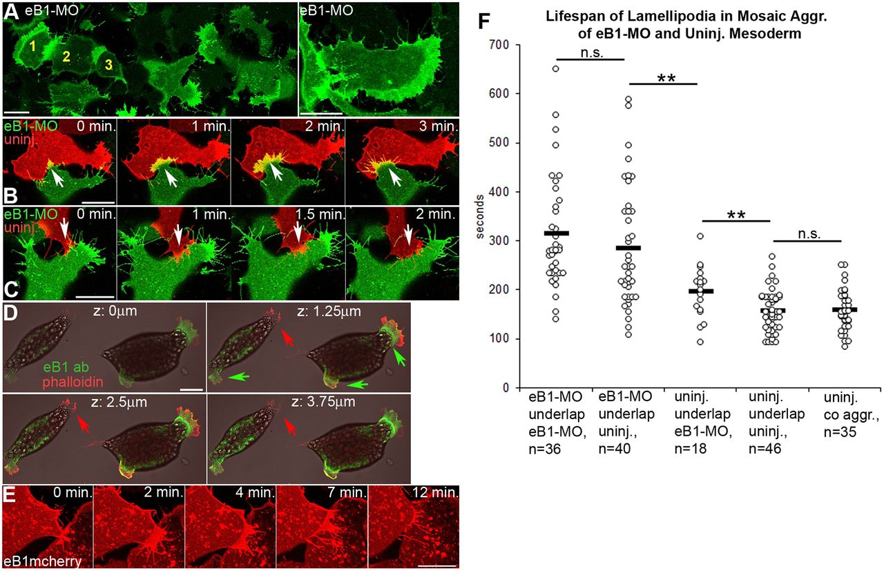 Ephrin B1 knockdown overcomes contact inhibition of lamellipodia. (A) eB1-MO-injected LEM aggregates form lamellipodia submarginally. Yellow numbers indicate serially underlapping cells. (B,C) Mosaic of eB1-MO-injected (membrane-GFP, green) and control cells (membrane-RFP, red). (B) eB1-MO cell underlaps uninjected cell. (C) Uninjected cell underlaps eB1-MO cell. White arrows indicate underlapping lamellipodia. (D) Immunofluorescence staining with eB1 antibody and secondary antibody (green), and phalloidin counterstaining (red), z-stack. Red arrows indicate lamellipodium without eB1 protein, green arrows indicate lamellipodia with eB1. (E) Underlapping of eB1-mCherry-overexpressing cells. (F) Lifespan of lamellipodia in mosaic aggregates. Black bars indicating the mean values. Statistical significance: **P<0.001, n.s., not significant. Scale bars: 30â