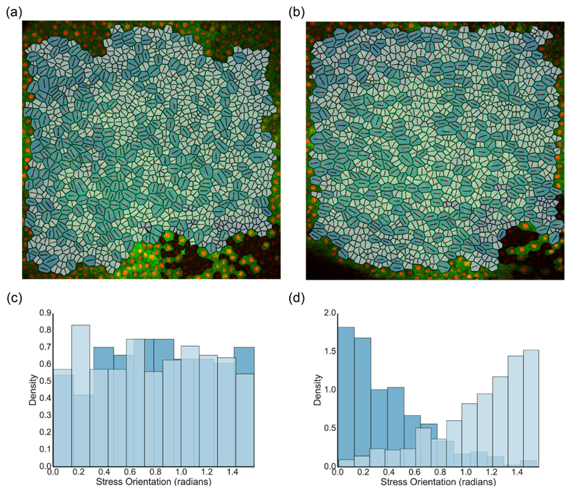 Fig. 2. (a) Epithelial apical layer of a Xenopus laevis animal cap, showing 801 cells rendered as polygons superimposed on the original microscopy image. Pαeff for each cell was calculated assuming Peff¯ = 0 and (Λ,Γ) = (−0.259,0.172). Line segments indicate the principal axis of shape and stress for each cell. Darker (lighter) cells have Pαeff>0 (<0) and exert a net inward (outward) force along each line segment. (b) The apical layer in (a) following a 35% instantaneous uniaxial stretch (horizontal) of the membrane beneath the basal cells, resulting in a 19.67 ± 1.91% (95% confidence interval) uniaxial stretch of the apical cells. (c), (d) Histograms showing the frequency density of orientation of the principal axis of stress for cells under tension (darker) and compression (lighter), for apical layers given in (a) [corresponding to (c)] and (b) [corresponding to (d)]; bin areas integrate to unity. Bin size was selected using the Freedman-Diaconis rule.