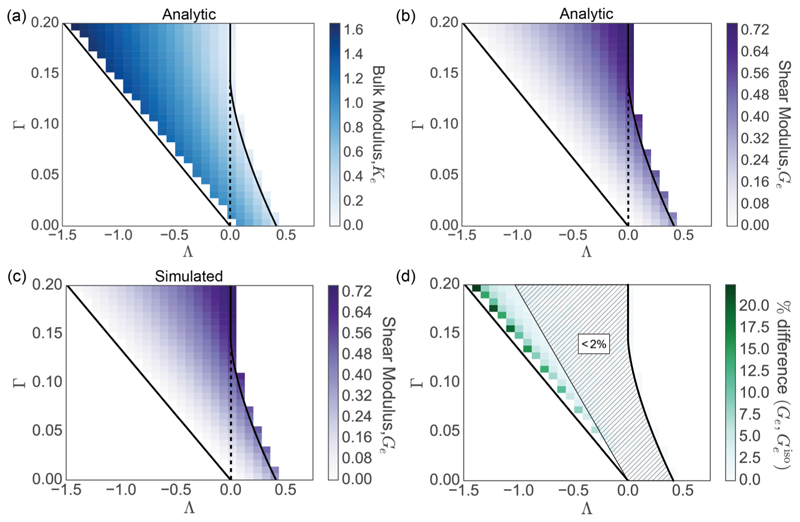 Fig. 6. (a) Heat map across discrete intervals of (Λ,Γ) parameter space showing the value of the analytic bulk elastic modulus Ke [calculated using (33)] of a disordered isotropic monolayer with 800 cells. (b) Equivalent plot of the analytic shear modulus [calculated using (37)]. (c) Computationally estimated shear modulus across parameter space. The elastic shear modulus Ge was estimated from the global perturbation stress as Δσxyℳ=−κGe, following a 1% simple-shear deformation (k = 0.01) on the simulated monolayers used in (b). Each data point is taken as an average from five realizations of a monolayer with 800 cells, with Pext = 0. (d) Percentage difference (|Ge−Geiso|/[0.5(Ge+Geiso)]) between the exact modulus Ge (37) and the approximation Geiso (38), across parameter space; the difference is below 2% in the hatched region.