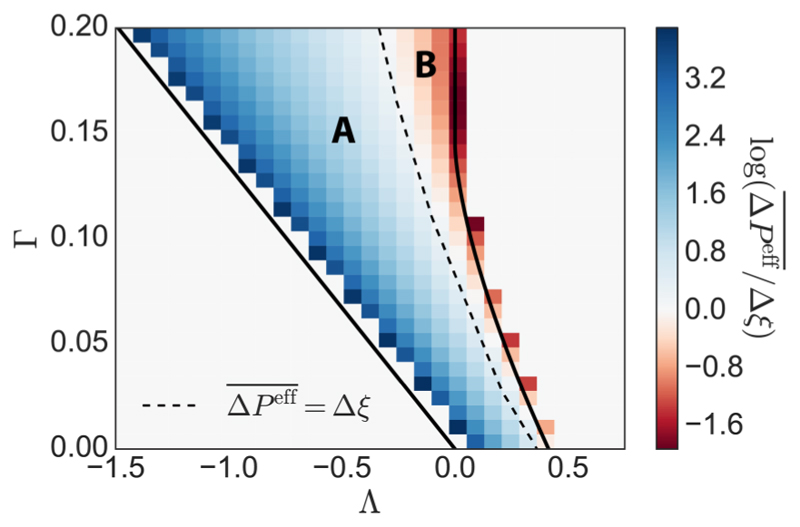Fig. 7. Heat map across discrete intervals of (Λ,Γ) parameter space showing the value of log(ΔPeff¯/ξ^). The dashed line represents the contour where ΔPeff¯=ξ^: Tissues show dominant resistance to area change in the shaded region to the left of the dashed line [where log(ΔPeff¯/Δξ)>0, region A], and to shear in the region to the right [where log(ΔPeff¯/Δξ)<0, region B]. A log scale is used to help display the differences across a large range of values. The monolayers used for all heat maps were the same as those used in Fig. 6, where each data point is taken as an average from five realizations of a monolayer with 800 cells, with Peff¯=0.