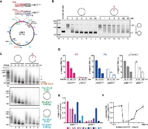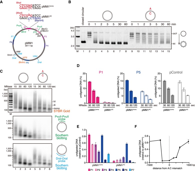 Figure 1. Nucleosomes are excluded from a >1-kb region surrounding a mismatch. (A) The DNA substrate used in this study. The 3011-base-pair (bp) DNA carries an A:T base pair (pMM1homo) or an A:C mispair (pMM1AC) at position 1. Positions of restriction enzyme sites used in this study, the site of biotin modification, and amplicons for quantitative PCR (qPCR) (P1: 2950–61, P2: 253–383, P3: 476–602, P4: 728–860, P5: 1498–1628, P6: 2266–2397, and P7: 2413–2537) are indicated. (B) Supercoiling assay in NPE. Covalently closed pMM1homo (lanes 2–8) or pMM1AC (lanes 9–15) was incubated in NPE and sampled at the indicated times. (Lane 1) Supercoiled pMM1homo purified from Escherichia coli was used as a size standard. (oc/r) Open circular or relaxed DNA; (sc) supercoiled DNA. (C) pMM1homo (lanes 1–4) or pMM1AC (lanes 5–8) was incubated in NPE for 60 min and digested by micrococcal nuclease (MNase). DNA samples stained with SYBR Gold (top) and Southern blotting with the PvuII–PvuII probe (middle) and the DraI–DraI probe (bottom) are shown. (D–F) The MNase assay described in C was repeated in the presence of a control plasmid (pControl), and undigested DNA was quantified by qPCR. The amount of DNA relative to the input (D) and normalized to pControl (E) and pMM1homo (F) is presented. Mean ± one standard deviation (SD) is shown. n = 3.