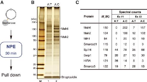 Figure 3. Identification of factors that are recruited onto mismatch-carrying DNA. (A) Schematic diagram of the plasmid pull-down assay. (B) Silver staining of mismatch DNA-binding factors. Samples were separated by SDS-PAGE and stained with silver nitrate. (A:T) pMM1homo; (A:C) pMM1AC. “M” indicates size markers. (C) Summary of mass spectrometry analysis. Spectral counts of the indicated proteins are listed along with their molecular masses. (Ex #1 and Ex #2) Independent experiments. See also Supplemental Table S1 for the complete list of identified factors.
