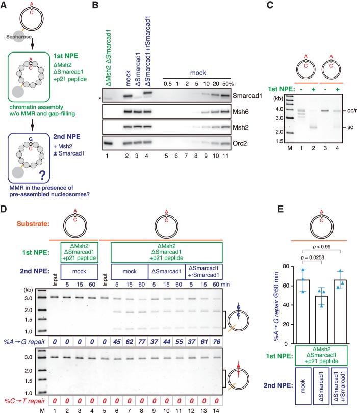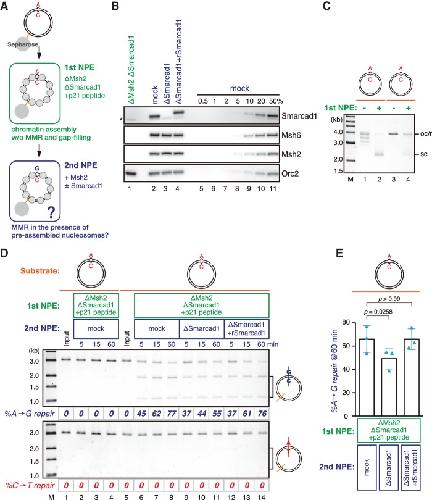 Figure 7. Smarcad1 facilitates MMR in the presence of preassembled nucleosomes. (A) Schematic diagram of the stepwise incubation assay. pMM1AC carrying a 15-nt gap on the A strand was immobilized on Sepharose beads and incubated in an Msh2- and Smarcad1-depleted NPE (1st NPE) containing 1 mg/mL p21 PCNA-binding peptide (NH2-KRRQTSMTDFYHSKRRLIFS-COOH) for 30 min. The plasmid was then transferred into the second NPE (2nd NPE) containing Msh2 and incubated for the indicated times. (B) The immunodepletion efficiencies of MutSα and Smarcad1. (*) Cross-reacting band. (C) Supercoiling assay in the first NPE. See also Supplemental Figure S6, F and G, for the effect of the p21 peptide on gap retention. (D) MMR efficiencies after the incubation in the second NPE. DNA was digested with XmnI and either BamHI (A-to-G repair; top) or XhoI (C-to-T repair; bottom). The percentage of repair was calculated based on the percentage of XhoI- or BamHI-sensitive DNA molecules. (E) Statistical analysis of the effect of Smarcad1 on MMR in the stepwise incubation assay. The A-to-G repair efficiencies are plotted in a graph. Mean ± one SD is shown. n = 3. P-values were calculated by the paired t-test (two-tailed). Blue triangles indicate individual values.