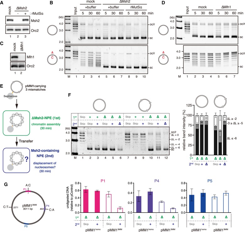 Figure 2. Nucleosome exclusion depends on the Msh2-containing complexes and involves nucleosome disassembly. (A) The immunodepletion efficiency of Msh2. To enhance the depletion efficiency, a mixture of Msh2 and Msh6 antibodies was used. Mock-treated (lane 1, mock) or Msh2-depleted (and Msh6-depleted) NPE (lanes 2,3, ΔMsh2) (0.25 µL of each) supplemented with either buffer (lanes 1,2) or 900 nM recombinant MutSα (lane 3) was separated by SDS-PAGE and probed with the indicated antibodies. Orc2 served as a loading control. The depletion efficiency was estimated as 99%. See also Figure 4A for codepletion of Msh6, Msh3, and other factors. (B) Supercoiling assay with pMM1homo (top) or pMM1AC (bottom) in NPE as described in A. See Supplemental Figure S2A–D for supercoiling and gap-directed MMR in Msh2- or Msh6-depleted NPE. (C) The immunodepletion efficiency of Mlh1. The depletion efficiency was estimated as 98%. (D) Supercoiling assay in NPE as described in C. See Supplemental Figure S2H for gap-directed MMR. (E) Schematic diagram of the nucleosome displacement assay. pMM1 carrying three mismatches at positions 1 (A:C), 803 (A:C), and 2271 (T:C) (pMM13MM; see also G) was immobilized on Sepharose beads and incubated in an Msh2-depleted NPE for 30 min. The plasmid was then transferred into the second NPE containing Msh2, incubated for an additional 30 min, and recovered. (F) Nucleosome displacement assay. pMM1homo (lanes 1–6) or pMM13MM (lanes 7–12) was sequentially incubated in the indicated extracts. (+) Mock-treated NPE; (Δ) Msh2-depleted NPE; (Skip) no incubation. The linking number of each band relative to the open circular or relaxed DNA (oc/r) position (ΔL) is indicated at the right of the gel. The ratio of the plasmids of the indicated ΔL was quantified and is presented as a graph. Mean ± one SD is shown. n = 5. (G) The nucleosome displacement assay was repeated without plasmid immobilization and in the presence of pControl. Instead of transferring plasmids, the second NPE was added directly to the first NPE to supply Msh2. The amount of DNA fragments relative to pControl after 60 sec of MNase digestion was quantified by qPCR. Mean ± one SD is shown. n = 3.