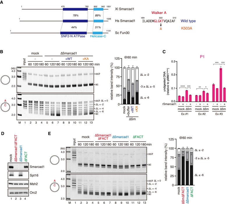 Figure 5. Smarcad1 and FACT assist nucleosome exclusion. (A) The domain architecture of Xenopus laevis (Xl) and Homo sapiens (Hs) Smarcad1 and Saccharomyces cerevisiae (Sc) Fun30. The positions and sequence identities of the SNF2 family N-terminal domain (SNF2-N ATPase) and helicase C-terminal domain (Helicase-C) are indicated. The sequence of isoform A was used for Xl Smarcad1. The amino acid sequence of the Walker A motif is presented. (B) Supercoiling assay in Smarcad1-depleted NPE. The linking number of each band relative to the open circular or relaxed DNA (oc/r) position (ΔL) is indicated. The ratio of the plasmids of the indicated ΔL was quantified and is presented as a graph. Mean ± one SD is shown. n = 3. See Supplemental Figure S4A for depletion efficiencies. (C) The MNase assay was performed as described in Figure 1D using Smarcad1-depleted NPE. (Ex #1, Ex #2, and Ex #3) Independent experiments. The amount of undigested DNA relative to pMM1homo is plotted as a graph. Mean ± one SD is shown. n = 3 technical replicates. P-values were calculated by the unpaired t-test (two-tailed). (*) P < 0.05; (**) P < 0.01; (***) P < 0.001; (****) P < 0.0001. (D) Immunodepletion efficiencies of Smarcad1 and FACT. Mock-treated (lane 1), FACT- and Smarcad1-depleted (lane 2), Smarcad1-depleted (lane 3), or FACT-depleted (lane 4) NPE was separated by SDS-PAGE and probed with the indicated antibodies. NPE (0.25 µL of each) was loaded. The depletion efficiencies for Smarcad1 and Spt16 were estimated as 98% and 95%, respectively. (E) The supercoiling assay in NPE described in D. The ratio of the plasmids of the indicated ΔL was quantified and is presented as a graph. Mean ± one SD is shown. n = 3.