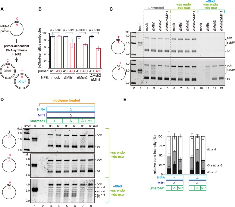 Figure 6. The nucleosome exclusion reaction counteracts DNA synthesis-coupled chromatin assembly. (A) Schematic diagram of the primer extension assay. A 92-nucleotide (nt) primer carrying either no mismatch or an A:C mismatch is annealed on a single-stranded pMM1. Upon incubation in NPE, complementary DNA is synthesized depending on the primer, converting the substrate into covalently closed circular DNA. (B) The requirements of canonical MMR factors for primer extension-coupled mismatch correction. The primer extension assay was performed in mock-treated, Mlh1-depleted (ΔMlh1), Msh2-depleted (ΔMsh2), or Msh2/Mlh1 doubly depleted (ΔMsh2ΔMlh1) NPE. The ratio of XhoI-sensitive molecules that correspond to the C-to-T repair products is plotted in a graph. Mean ± one SD is shown. n = 4. P-values were calculated by the unpaired t-test (two-tailed). Note that the ratio did not reach 100% even with a homoduplex primer because of the presence of some residual primer extension intermediates. See also Supplemental Figure S6, D and E, for the details of quantification. (C) Nucleosome exclusion on the primer extension products. The products described in B were separated by agarose gel without any treatment (lanes 2–5), after digestion of incomplete intermediates by S1 nuclease and ExoV (lanes 6–9), or after digestion of C-to-T repair products and incomplete intermediates by XhoI, S1 nuclease, and λ exonuclease (lanes 10–13). (ss) ssDNA; (IM) primer extension intermediates. (D) The assay presented in C was repeated in NPE depleted of Mlh1 and HIRA (lanes 3,4) or Mlh1, HIRA, and Smarcad1 (lanes 5–8) supplemented with either buffer (lanes 3–6) or recombinant Smarcad1 (lanes 7,8). The linking number of each band relative to the open circular or relaxed DNA (oc/r) position (ΔL) is indicated at the right of the gel. (E) The ratio of the plasmids of the indicated ΔL in D and Supplemental Figure S5F was quantified and is presented as a graph. Mean ± one SD is shown. n = 3.