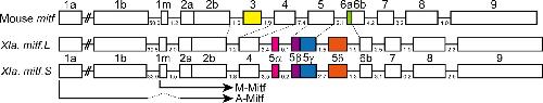 Figure 1. Comparison of mitf exons between X. laevis and mouse. Exons used to produce A‐Mitf and M‐Mitf are indicated as boxes and numbered according to Hallsson et al. (). The exons present between exon 4 and exon 6b in X. laevis mitf were named 5α, 5β, 5γ, and 5δ. The continuous exons 5β and 5γ were thought to be identical to mouse mitf “exon 5” (see Figure for details). Both mitf.L and mitf.S differ from mouse mitf by the absence of exons 3 and 6a, and the presence of exons 5α and 5δ. Intron lengths (kb) in mouse mitf (Bharti, Liu, Csermely, Bertuzzi, & Arnheiter, ), mitf.L (NC_030730.1), and mitf.S (NC_030731.1) are shown.