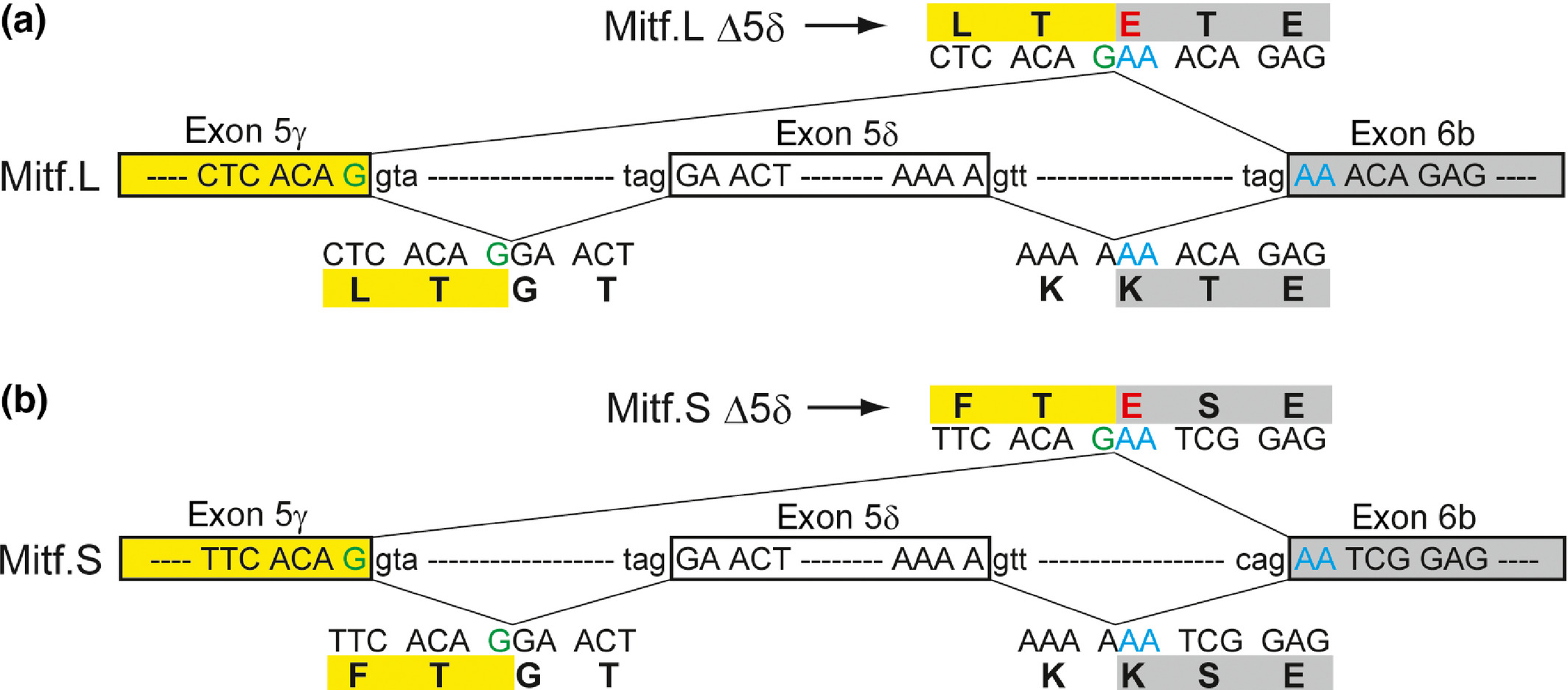 Figure 4. Alteration of a single amino acid associated with exon skipping in transcript variants of Mitf.L (a) and Mitf.S (b). When exon 6b is linked to exon 5δ, the amino acid in the beginning of exon 6b is a Lys (K) in both Mitf.L and Mitf.S. However, in the transcripts skipping exon 5δ (Mitf.L Δ5δ and Mitf.S Δ5δ), the amino acid in the beginning of exon 6b is a Glu (E). These Mitf transcript variants skipping exon 5δ are present both in the wild type and the mutant (see Figure ).