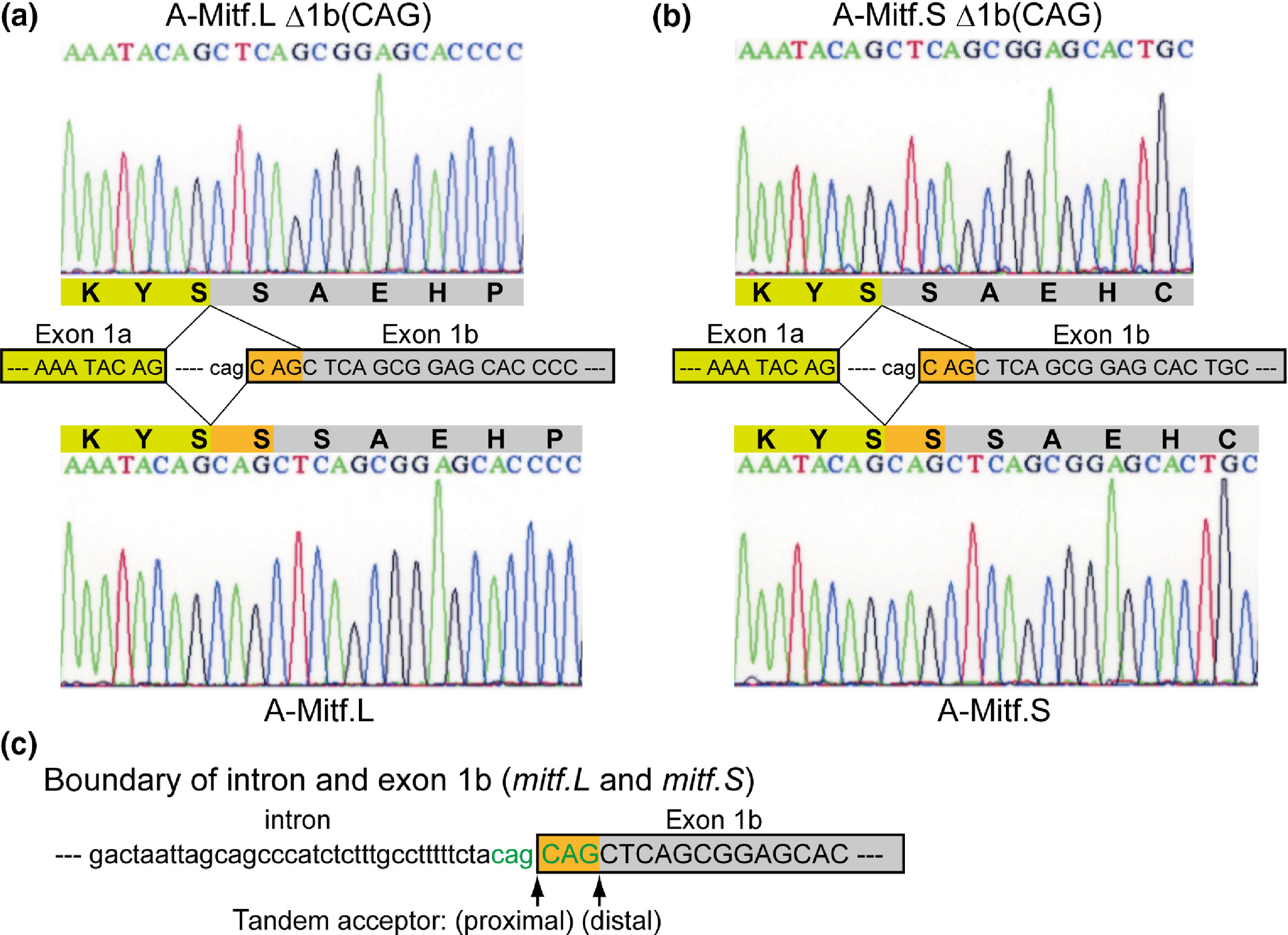 Figure 6. Newly identified transcript variants, A‐Mitf.L Δ1b(CAG) and A‐Mitf.S Δ1b(CAG), produced by alternative splicing at the acceptor site (CAG) in exon 1b in the mutant. The DNA chromatogram, amino acid sequences, and splice site of exon 1b in A‐Mitf.L (a) and A‐Mitf.S (b) are shown. Subgenome genes, mitf.L and mitf.S, have the identical sequence around the boundary of intron and exon 1b, where tandem splice sites (CAGCAG acceptors) are present (c). There is no difference in the sequence around the acceptor site of exon 1b of the wild type and the mutant. Alternative splicing at the tandem acceptor (CAG) in exon 1b leads to the deletion of one amino acid, Ser (S), in both A‐Mitf.L and A‐Mitf.S.