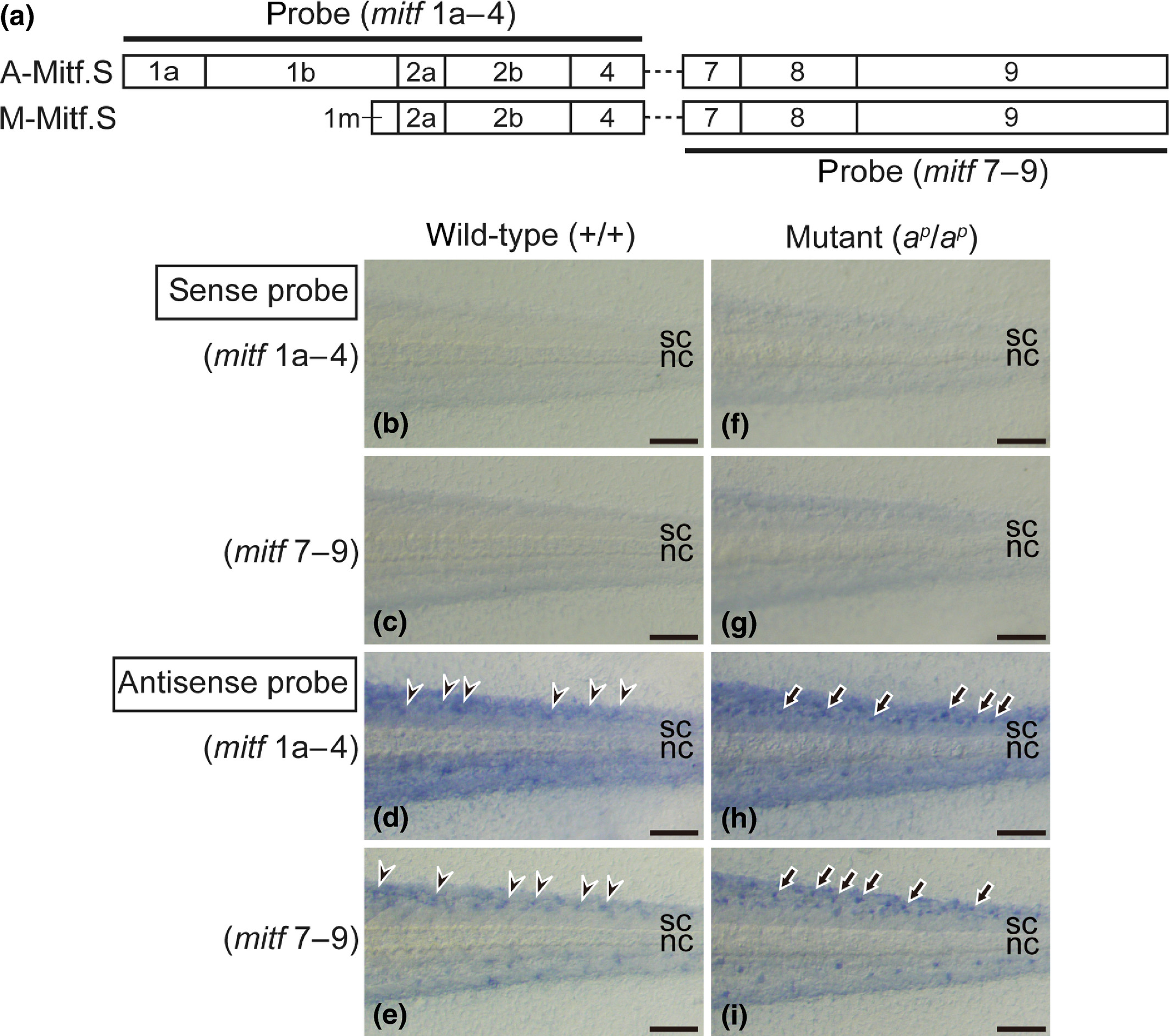 Figure 7. Expression of mitf mRNA in white pigment cells and melanophores. RNA probes were generated from the sequence encoding either exons 1aâ4 or exons 7â9 of Mitf.S (a). Photographs of the wildâtype tail (bâe) and the mutant tail (fâi) at stage 46 are shown. Tadpoles were bleached to remove melanin before hybridization. In the negative control using a sense probe of either mitf 1aâ4 or mitf 7â9, no staining was observed in the tails of either the wild type (b, c) or the mutant (f, g). WISH using an antisense probe of mitf 1aâ4 (d, h) indicated that staining was observed in melanophores in the wildâtype tail (d, arrowheads) and white pigment cells in the mutant tail (h, arrows). Using an antisense probe of mitf 7â9, staining was also detected in melanophores in the wildâtype tail (e, arrowheads) and white pigment cells in the mutant tail (i, arrows). nc, notochord. sc, spinal cord. Scale bars: 100 μm.