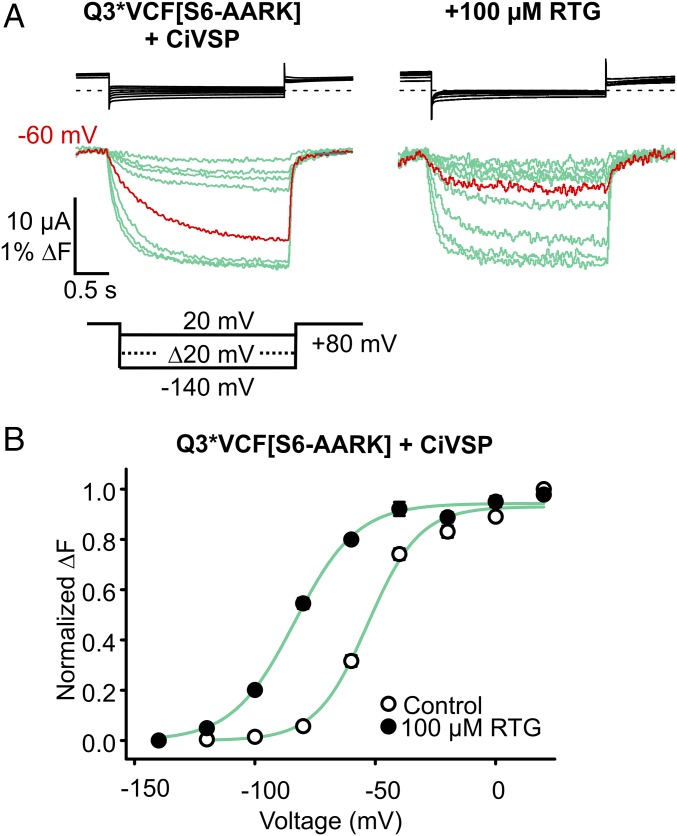 Retigabine (RTG) is a first-in-class antiepileptic drug that suppresses neuronal excitability through the activation of voltage-gated KCNQ2-5 potassium channels. Retigabine binds to the pore-forming domain, causing a hyperpolarizing shift in the voltage dependence of channel activation. To elucidate how the retigabine binding site is coupled to changes in voltage sensing, we used voltage-clamp fluorometry to track conformational changes of the KCNQ3 voltage-sensing domains (VSDs) in response to voltage, retigabine, and PIP2. Steady-state ionic conductance and voltage sensor fluorescence closely overlap under basal PIP2 conditions. Retigabine stabilizes the conducting conformation of the pore and the activated voltage sensor conformation, leading to dramatic deceleration of current and fluorescence deactivation, but these effects are attenuated upon disruption of channel:PIP2 interactions. These findings reveal an important role for PIP2 in coupling retigabine binding to altered VSD function. We identify a polybasic motif in the proximal C terminus of retigabine-sensitive KCNQ channels that contributes to VSD-pore coupling via PIP2, and thereby influences the unique gating effects of retigabine.