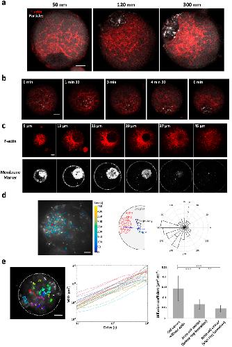 Figure 2. Characteristics of the membrane-free compartmentalization mediated by F-actin flow.(a) F-actin dynamics transport nanoparticles in a size-dependent manner. Accumulation of nanoparticles of different sizes (50ânm, 120ânm, and 300ânm) shows that only nanoparticles above a diameter of 100ânm are transported by F-actin flow. (b) Time-dependent accumulation of 120ânm fluorescent nanoparticles. After 6âminutes, almost all the nanoparticles are gathered at the center of the F-actin ring. (c) Confocal observations of F-actin ring-like structures show that microfilaments encompass cytoplasmic materials stained with membrane marker. Slices of a z-stack; images are 8âμm apart (from 5 to 45âμm in the droplet). (d) Left: Displacement field of 300ânm-nanoparticles reveals that their motions are highly directed towards the F-actin ring. Right: Angular distribution of tracked trajectories with respect to the actin ring position. (e) Estimation of the cytoplasmic diffusion coefficients in cell extracts incompetent for F-actin organization, and contractile cell extracts at early stage and late stage of F-actin ring organization. Mean and standard deviation are plotted. Scale bars are 10âμm. |