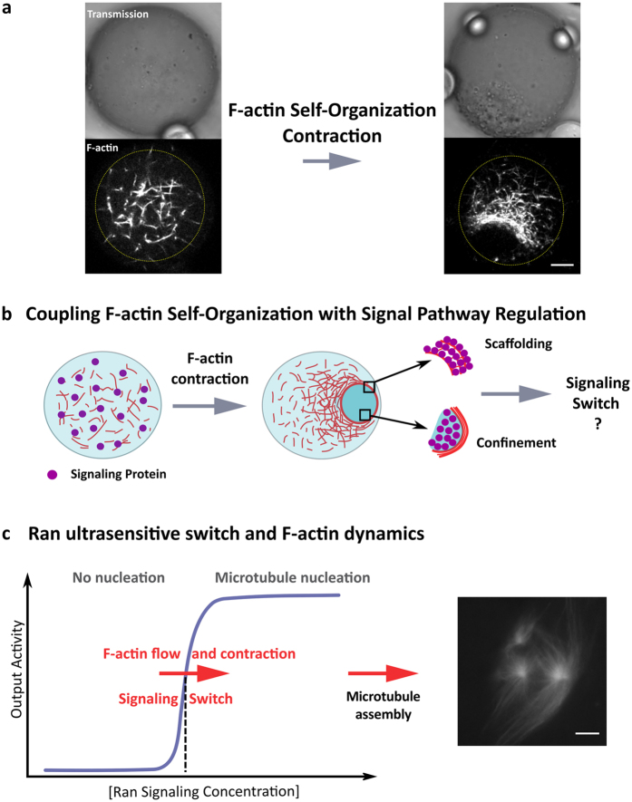 Figure 1. Membrane-free confinement mediated by F-actin self-organization to localize and trigger signaling pathways.(a) The confinement of egg extracts within oil droplets leads to the spontaneous generation of a centripetal F-actin flow that eventually forms a contractile ring-like structure. F-actin flow conveys cytoplasmic materials that are trapped by the filament meshwork. Actin microfilaments were labeled with Utr-GFP. Scale bar is 10âμm. (b) Schematic of the concept of signaling localization and switch: F-actin self-organization powered the active compartmentalization of nanoparticles operating as signaling platforms or the scaffolding of signaling proteins by F-actin polymers. Starting from a homogeneous distribution of signaling proteins, the generation of the F-actin flow drives the concentration enhancement of regulatory elements that could trigger signal pathway. (c) The activity of Ran GTPase is characterized by a non-linear response following a sigmoidal response with the concentration (ultrasensitive switch). The nucleation of microtubules is triggered above a concentration threshold of Ran. Our hypothesis is that the F-actin self-organization into a contractile meshwork will trigger the Ran signaling pathway and the nucleation of microtubules. |