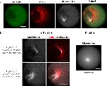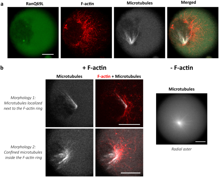 Figure 3. Characterization of asters nucleated with RanQ69L in an F-actin intact cell extract.(a) Microtubule asters nucleated with 8âμM of RanQ69L. The microtubules are localized and confined within F-actin ring. mCherry-labeled RanQ69L observation indicates an homogenous distribution of Ran within the droplet. (b) Two types of morphologies are observed when microtubule nucleation is triggered in presence of F-actin: asymmetric asters localized inside the F-actin ring and asymmetric asters localized outside the F-actin ring. In absence of F-actin we observed a radial aster. F-actin was labeled with Utr-GFP and fluorescent (TRITC) tubulin was used to visualize microtubules. Scale bars are 10âμm. |